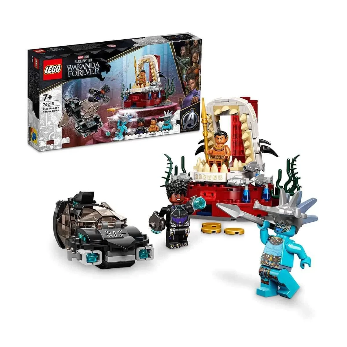 • Marvel karakterleri; Shuri, Attuma ve Kral Namor mini figürleri dahildir. İnşa edilebilen denizaltı ve taht odası, ayrıca deniz yosunu ve balık aksesuarlarına sahiptir.
