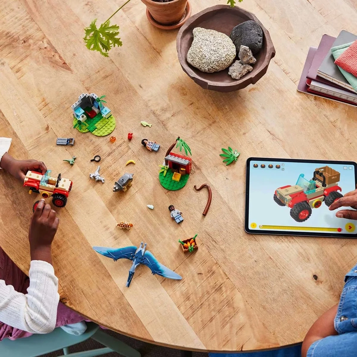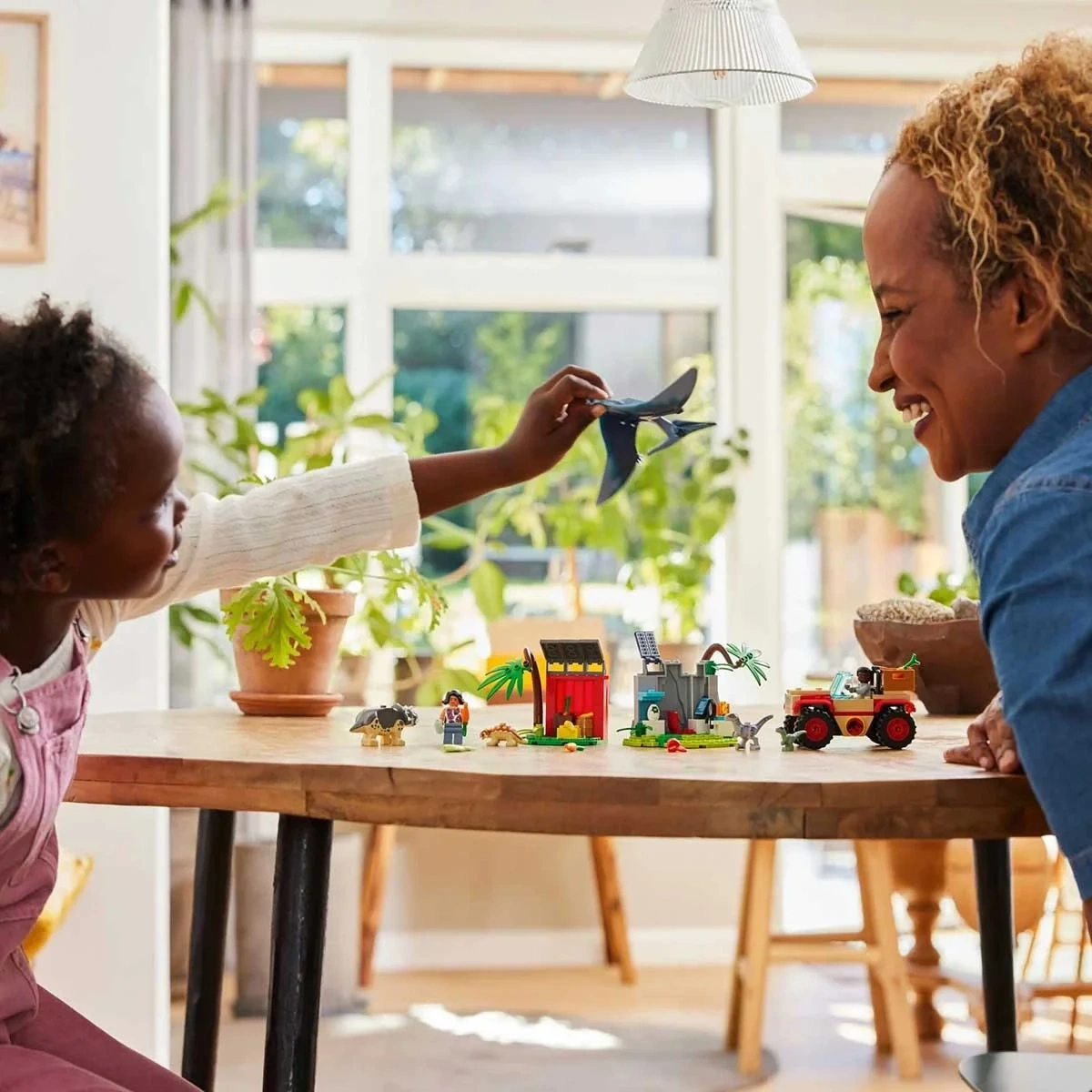 Arazi aracını merkeze sürün ve kutuyu indirin. Küçük dinozorların bulması için yiyeceği kulübenin yanına koyun.