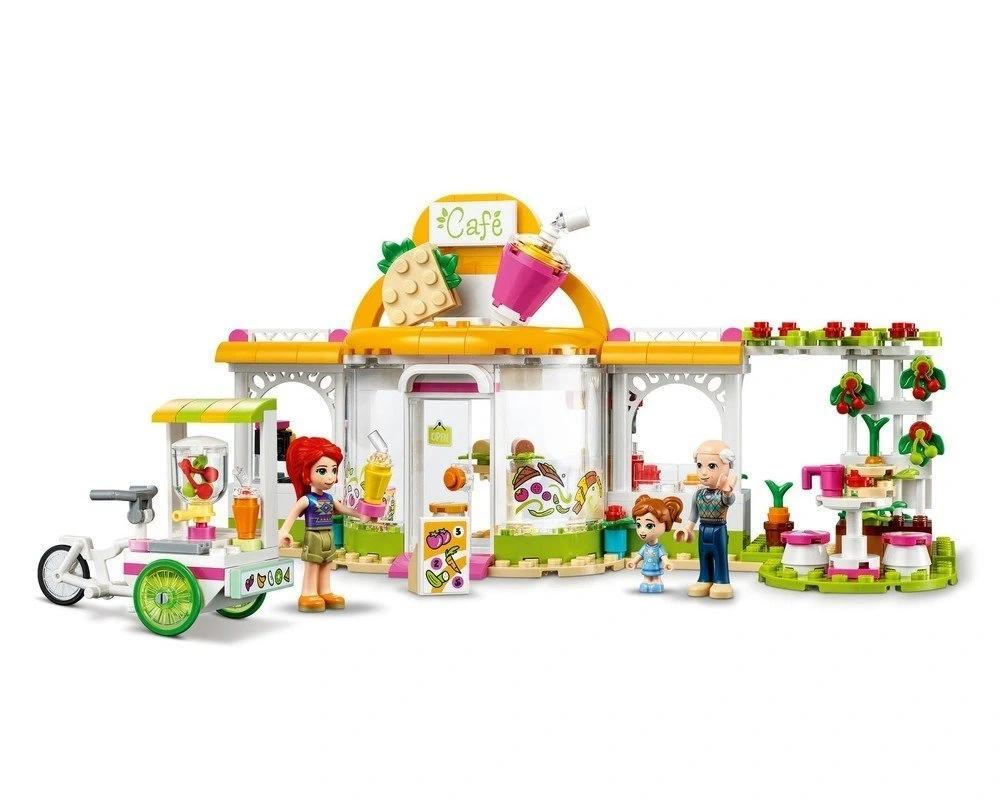 Oyun başlatıcılarla dolu Heartlake City Organik Kafe (41444), tuğla tuğla daha iyi bir dünya inşa etmek isteyen erkek ve kız çocuklar için oyuncak bir sebze bahçesi ve meyve suyu dağıtım bisikleti içerir.