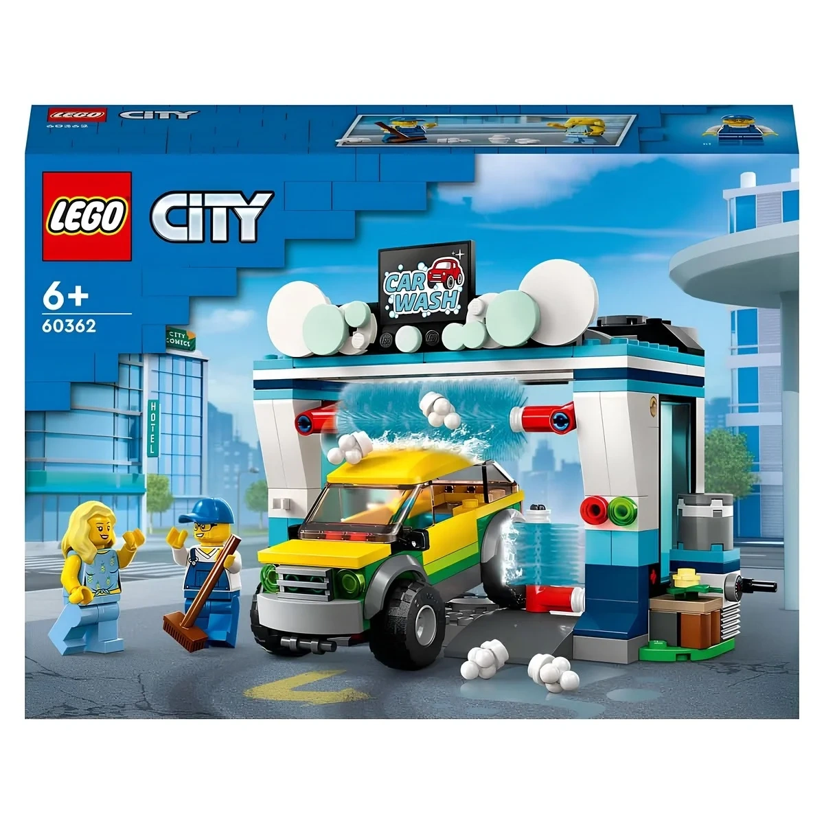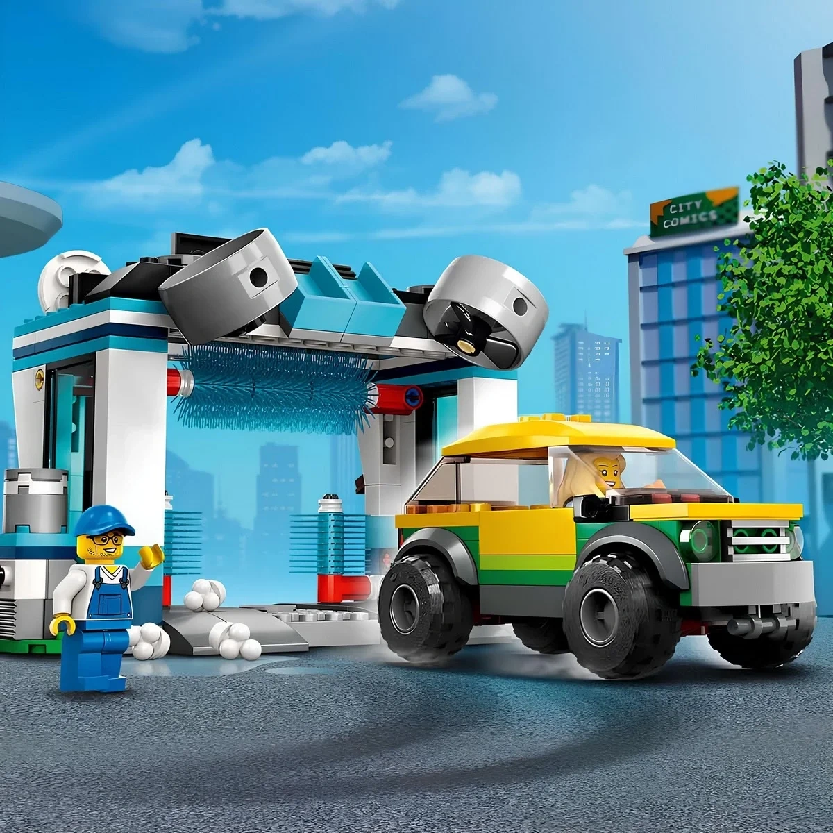Dönen yıkama fırçaları, hareket edebilen kurutucu fanlar, köpük kabı, hava pompası ve oyuncak araba içeren LEGO City Oto