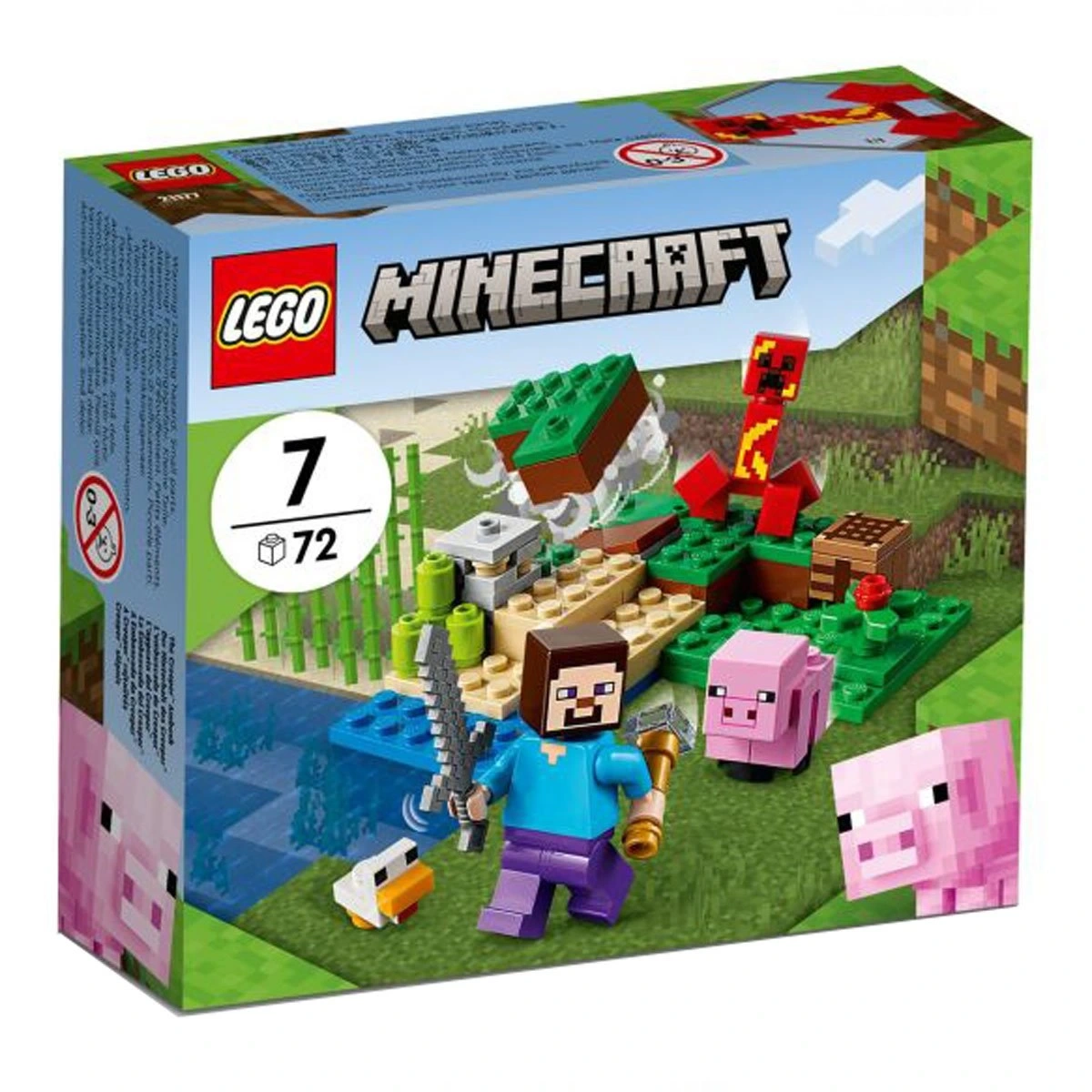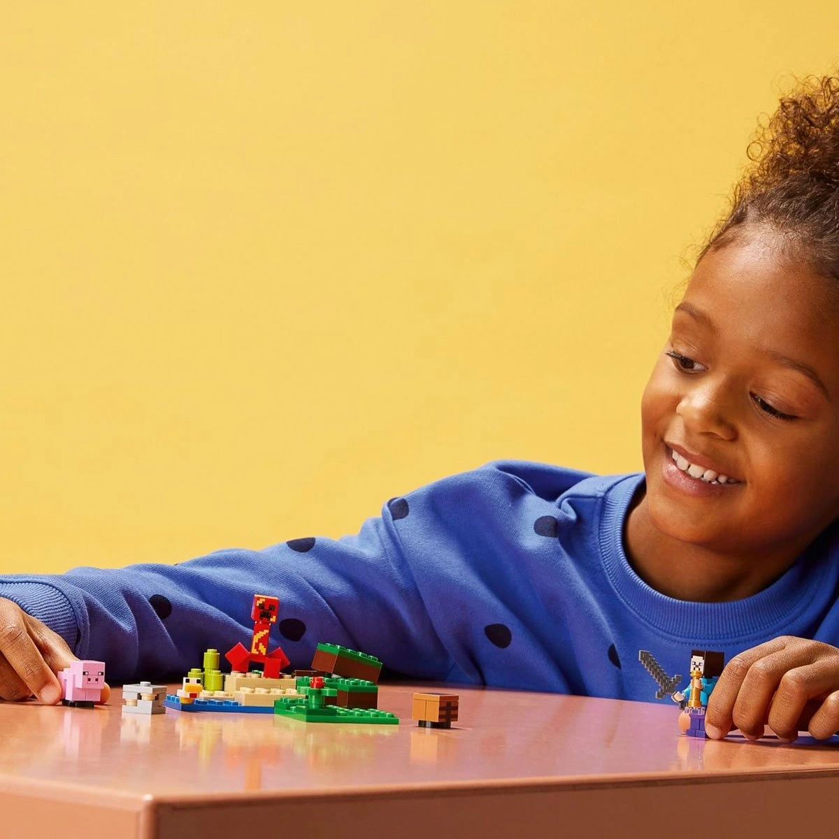 Bu kompakt, klasik Minecraft macerasında çocukları meşgul edecek çok şey var. Oyunun kahraman karakterlerinden biri olan Steve’e bir yavru domuz, bir civciv ve bir Patlayan Creeper katılıyor. Çocuklar önce çalışma masasında demir cevheriyle yaratıcılıklarını gösterir. Daha sonra hayvanlarla ilgilenir, ektikleri şeker kamışına bakar ve sahneyi gelinciklerle süslerler. Daha sonra korkunç Patlayan Creeper ile savaşmak için kılıcı kullanırlar. Çocukların özel patlayıcı bloğu itmesiyle savaş zirveye ulaşır ve Patlayıcı Creeper havaya uçar. O günün aksiyonu bittiğinde bu eğlenceli set, çocuk odasında sergilendiğinde harika görünür.