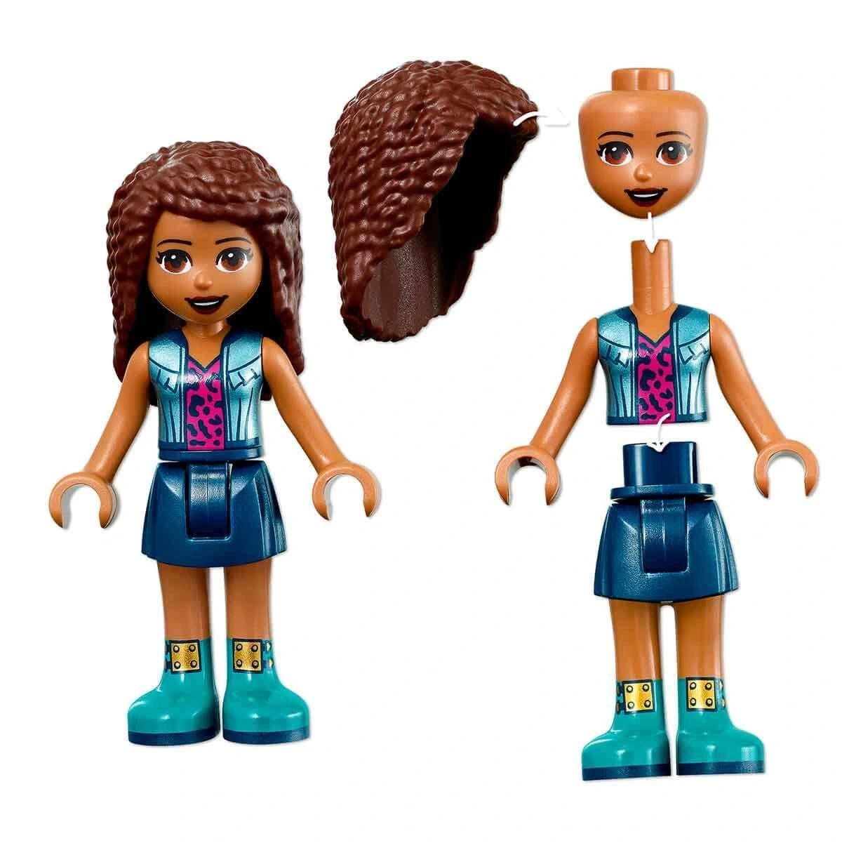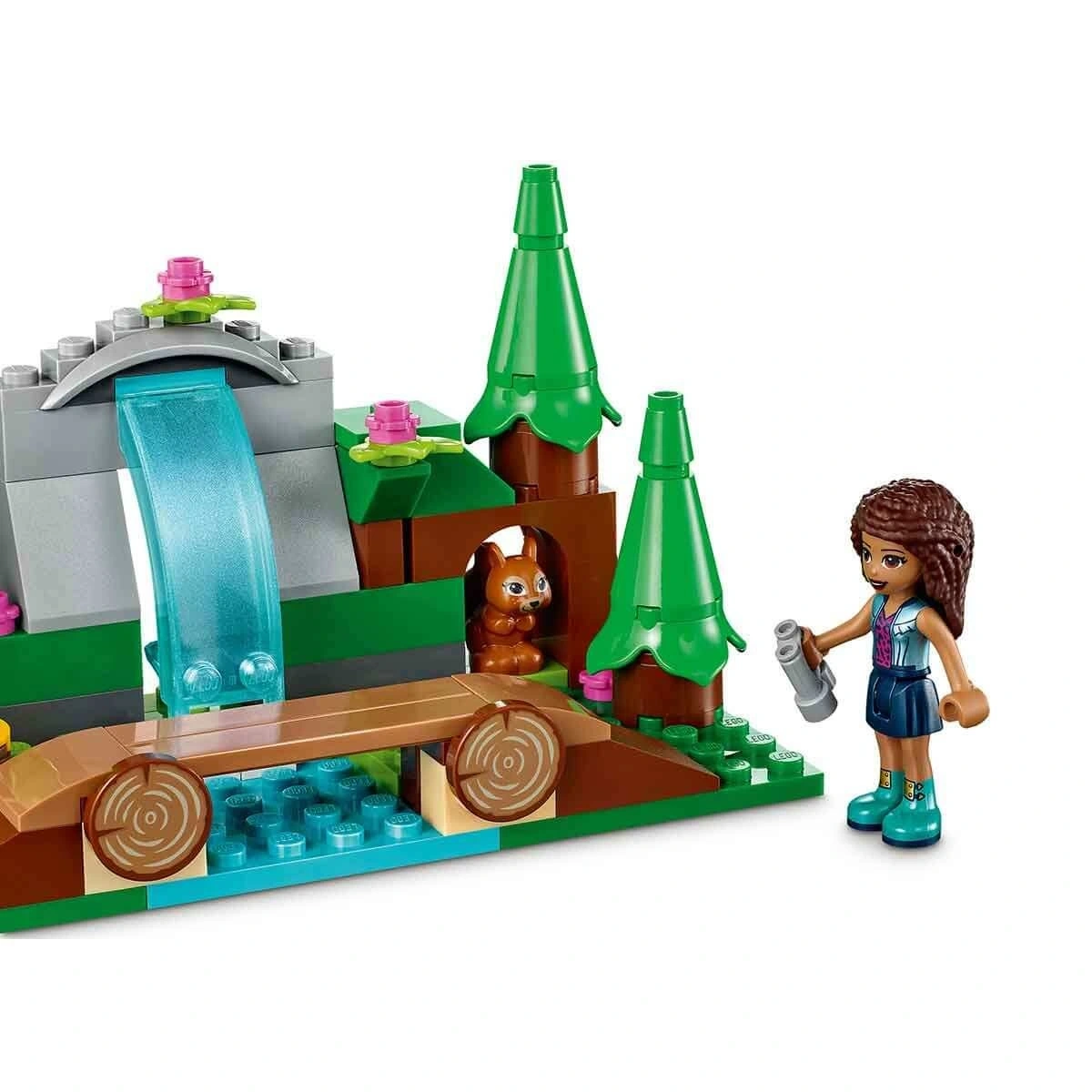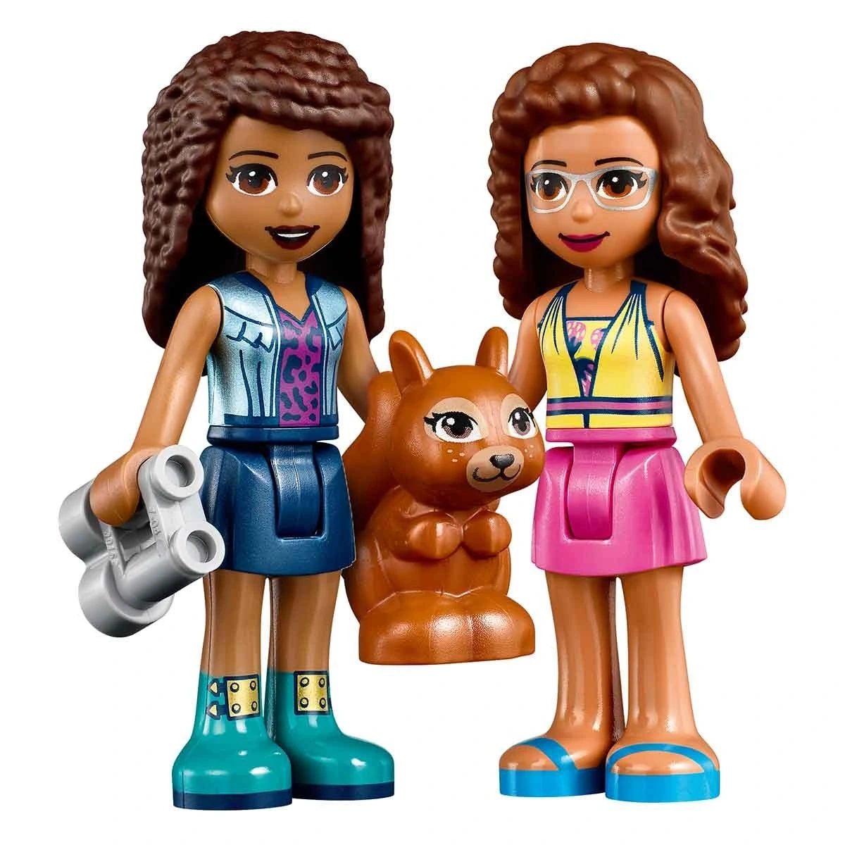 LEGO Friends Andrea ve Olivia mini bebekler, bir sincap figürü, motosiklet, kamp ateşi, çubukta marşmelov, nehir üzeirnde bir köprü ve bir orman şelalesi içerir.