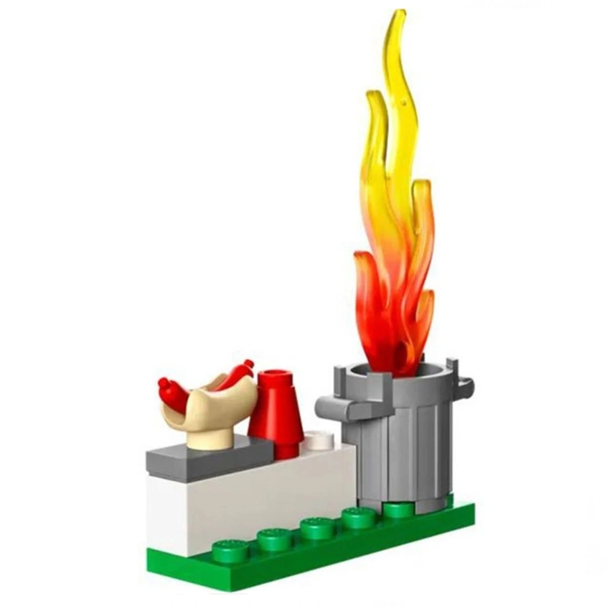 Bir oyuncak yangın helikopteri yapmak için ihtiyacınız olan her şey bu sette mevcut, ayrıca itfaiyeci ve satıcı minifigürleri, LEGO alevli bir çöp kutusu ve yanmış bir sosisli sandviç dahil eğlenceli aksesuarlar.