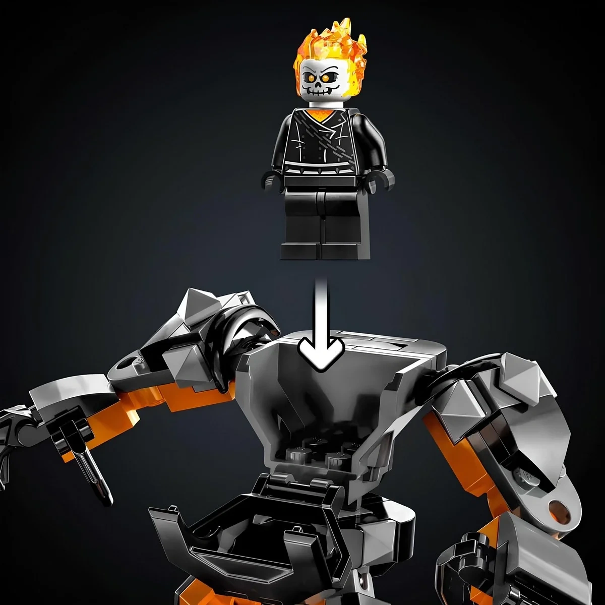 Çocuklar, Ghost Rider LEGO mini figürünü Ghost Rider robotunun açılan kokpitine yerleştirir. Eklemli robot, hareketli kollara,