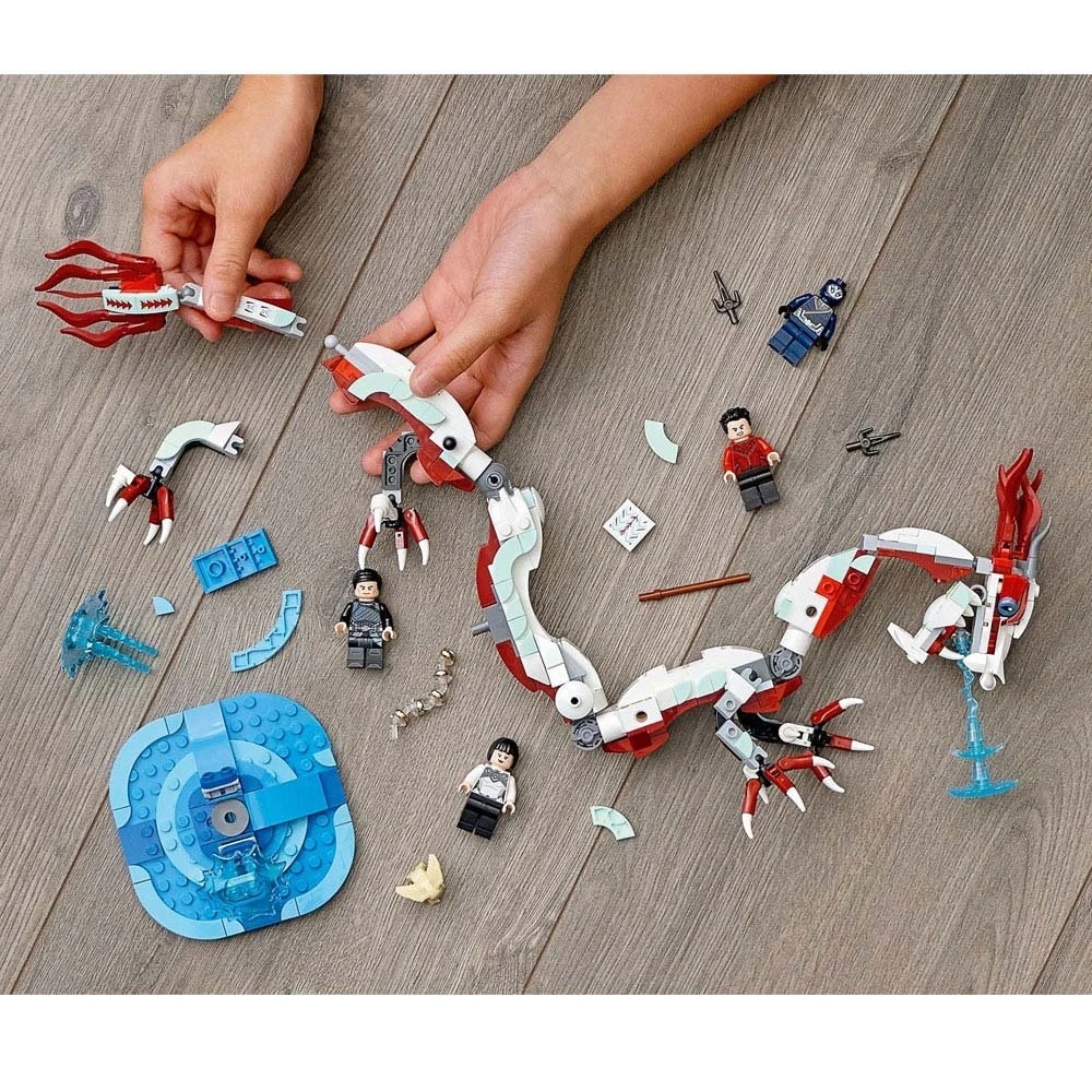 Shang-Chi, Xialing, Wenwu ve Ölüm Saçan olmak üzere 4 minifigür ve ayrılabilir su tabanlı, parçalarla yapılan, eklemli bir ejderha dahildir.