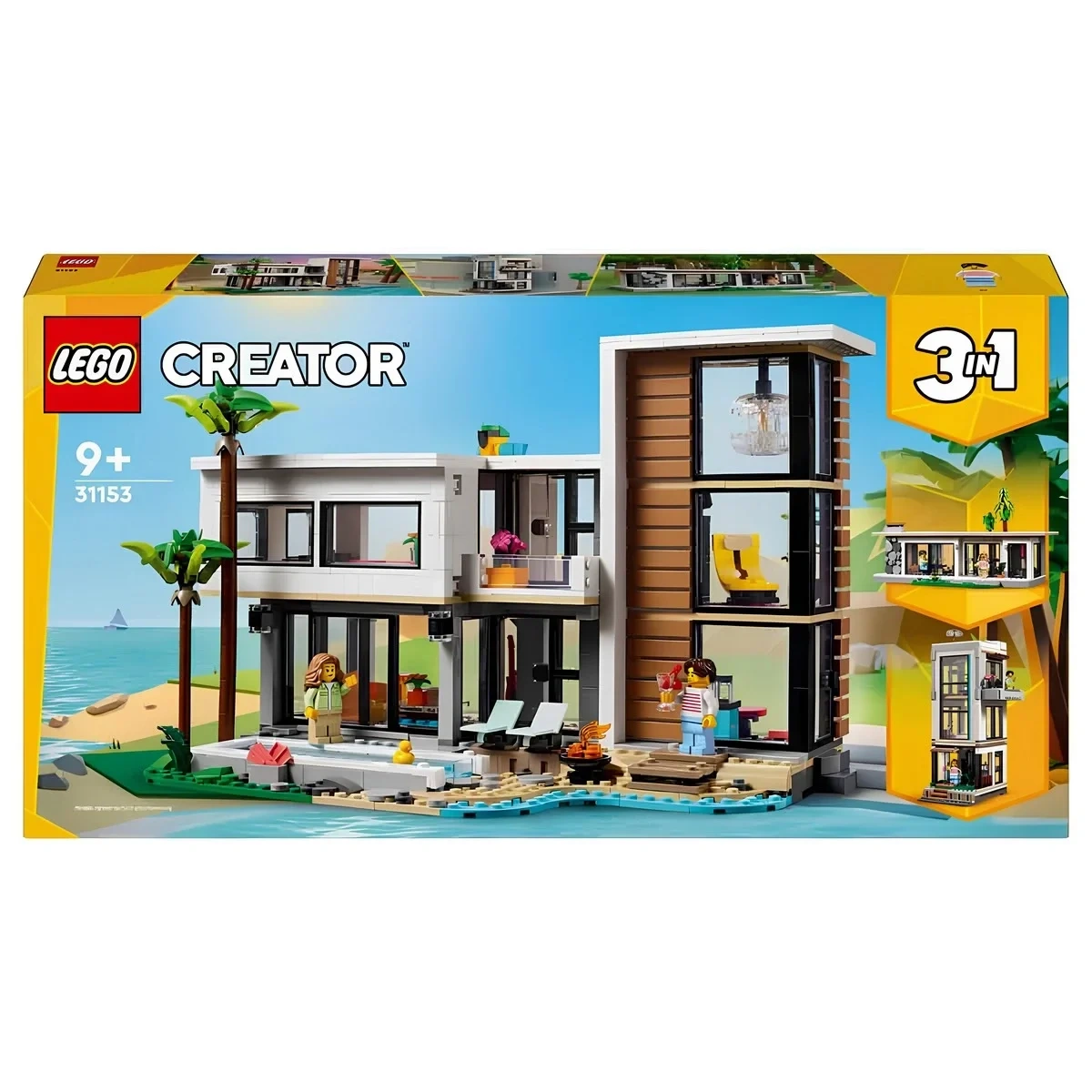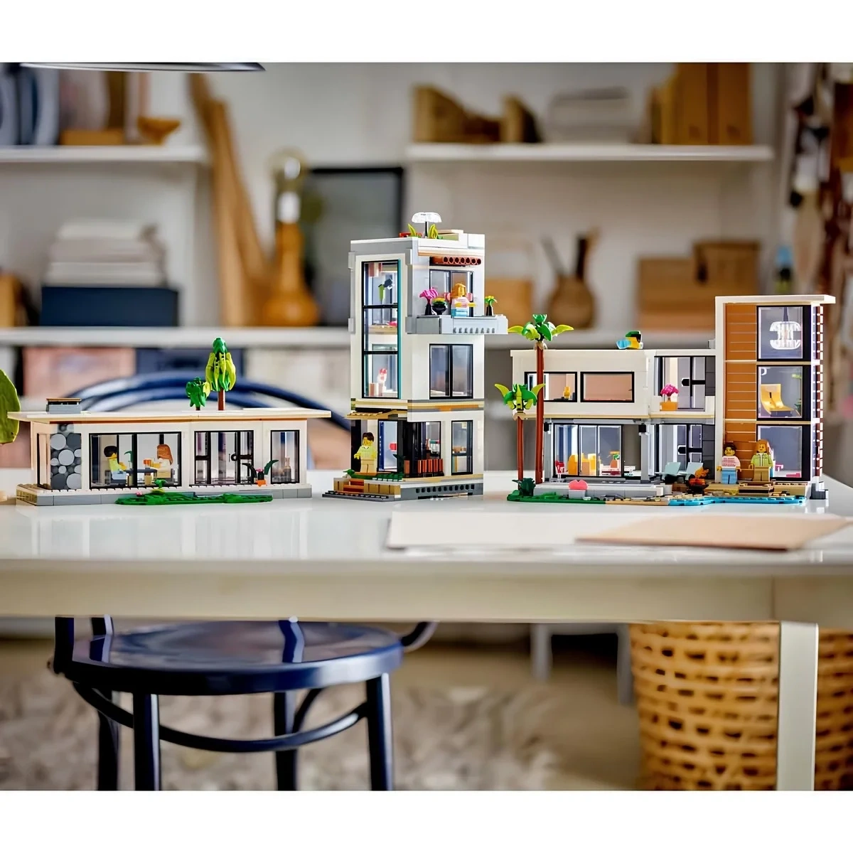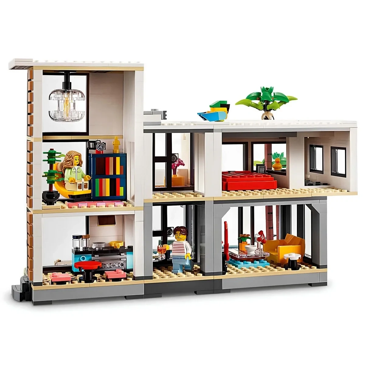 Çocuklar, bu eğlenceli Modern Ev oyun setiyle 3 farklı LEGO oyuncak evini keşfedebilir. 2 palmiye ağacının gölgesindeki 2 katlı