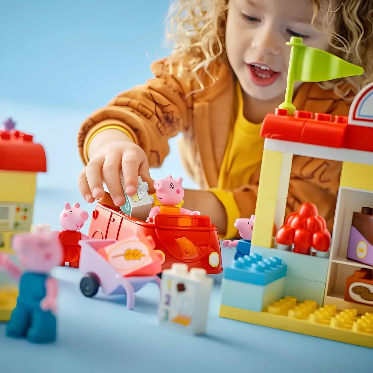 Çocuklar için eğitici LEGO DUPLO Peppa Pig oyuncağı, çizgi diziden ilham alan alışveriş oyunları oynarken mantıklı düşünme