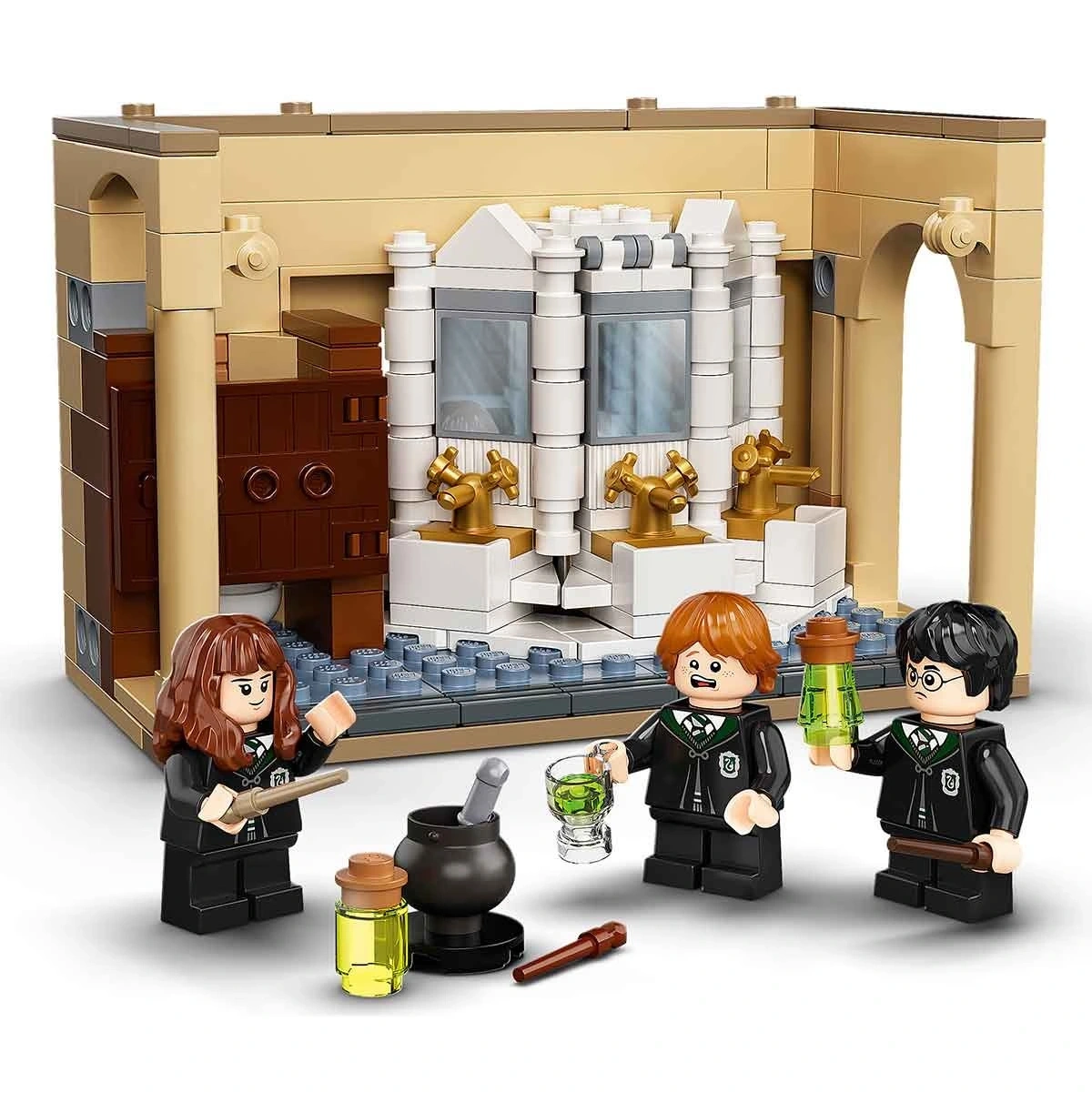 Harry Potter, Hermione Granger ve Ron Weasley minifigürleri, ayrıca parçalarla yapılan Mızmız Myrtle'ın tuvaleti ve aslına uygun aksesuarlar bulunur.