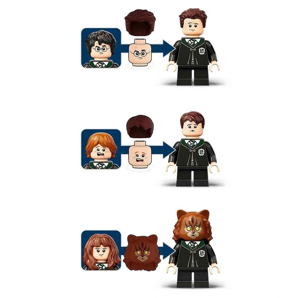Genç cadılar ve büyücüler, güçlü bir Çok Özlü iksir hazırlayan Harry Potter, Ron Weasley ve Hermione Granger’a katılır. Çocuklar, minifigürlerin başını çevirip alternatif yüzü ortaya çıkararak ve farklı bir saç takarak iksiri içen karakterleri Vincent Crabbe ve Gregory Goyle’a dönüştürebilir. Ancak Hermione kediye dönüştüğünde büyüde aksilik olabilir! Başka sürprizler de var: yıl dönümüne özel benzersiz, altın bir Harry Potter minifigürü; koleksiyonluk 2 rastgele büyücü kartı karosu ve lavabonun altında gizli bir tünel. Bu set LEGO Harry Potter Hogwarts Sırlar Odası ile birleştirildiğinde, gizli tünel 2 odayı birbirine bağlayarak oyun olasılıklarını daha da arttırır. Bu sihirli modüler sistem, çocukların odalar eklemeye devam ederek tüm Hogwarts Şatosu modelini yapmalarına olanak tanır.