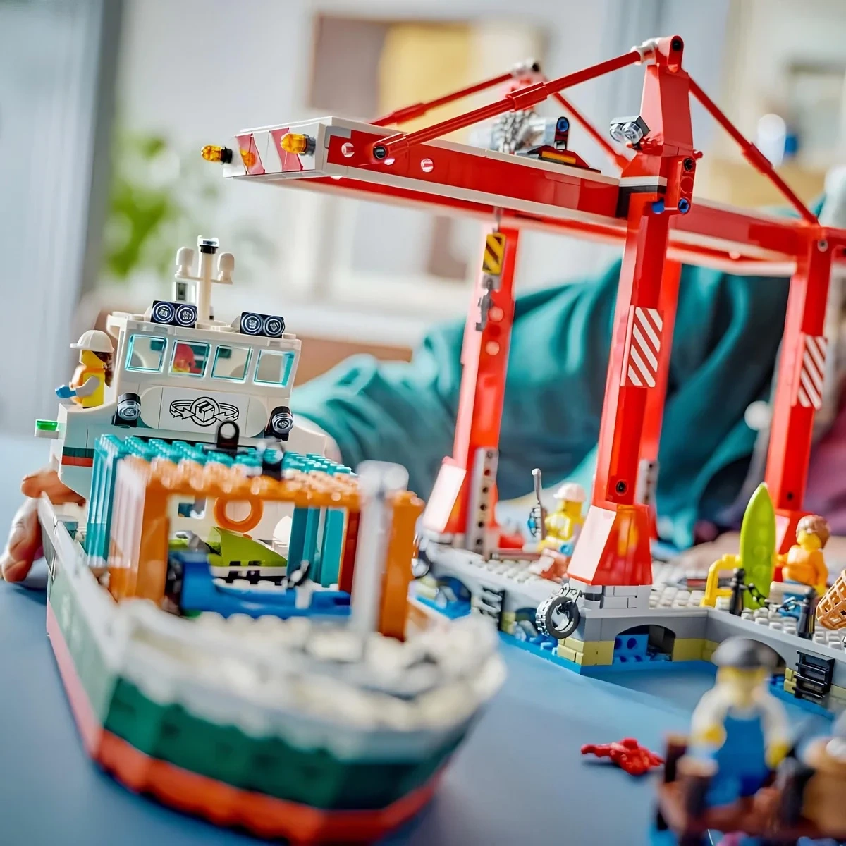 Bu yaratıcı yapım oyuncağında bir LEGO gemisi, 2 kargo konteyneri, çalışan bir konteyner vinci, mağazası ve restoranı olan