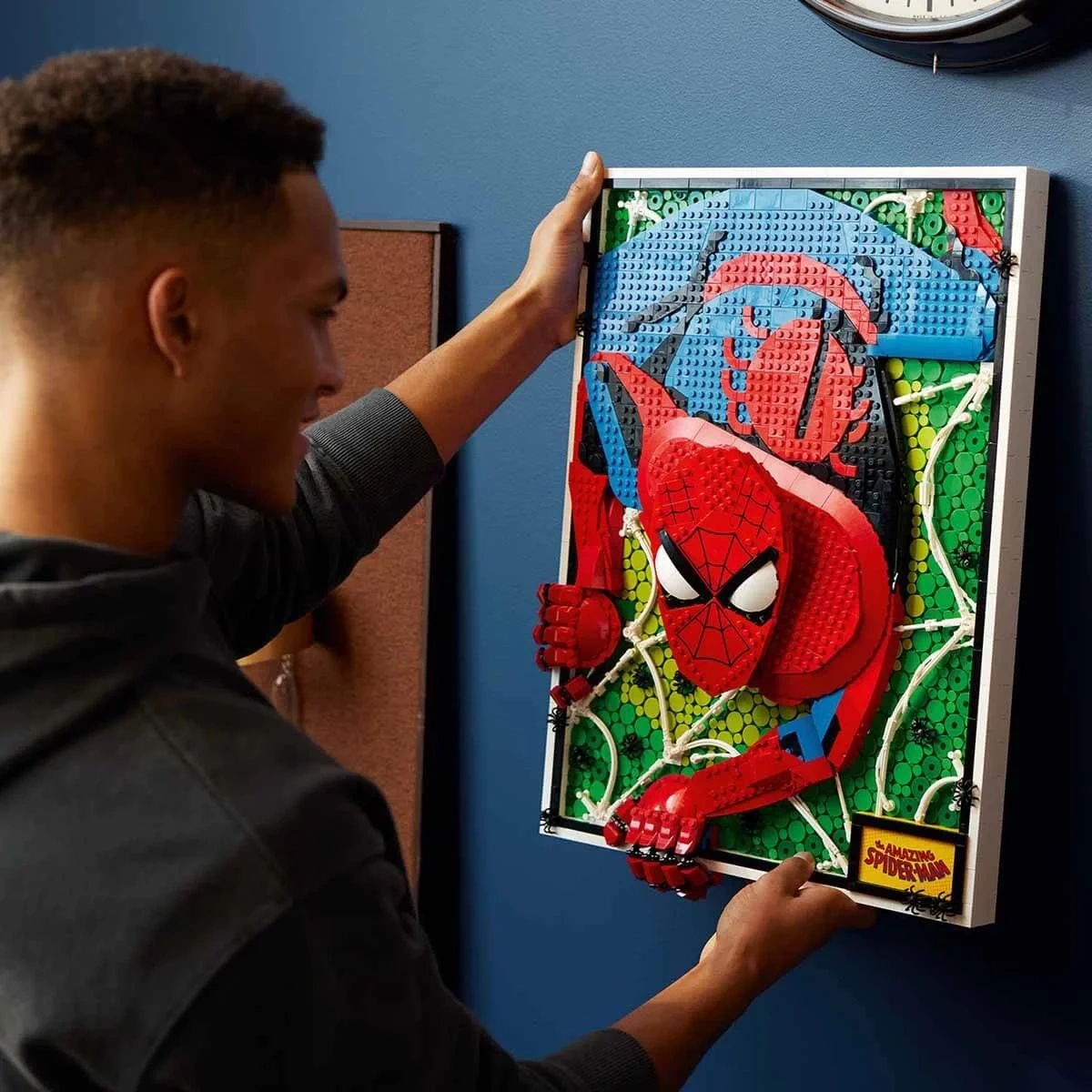 Süper kahraman hayranları için hediye! Bu LEGO Art setinin yüksekliği 54 cm, genişliği 41 cm’dir ve sıkı Örümcek Adam ve klasik